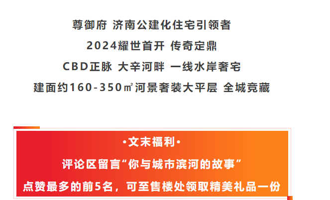 ·文末福利·評論區留言“你與城市濱河的故事”點贊最多的前5名,可至售樓處領取精美禮品一份 1、本項目推廣名為尊御府;開發公司為山東航泰匯智產業發展有限公司。2、本資料僅為要約邀請,相關宣傳內容不排除因政府規劃、規定及出賣人分期規劃、未能控制等原因而發生變化。3、買賣雙方的權利義務具體以雙方簽訂的購房合同及其附件資料為準,開發商保留調整/修改本資料的權利。4、本宣傳資料所涉及的戶型等宣傳內容僅供參考,不同樓棟、不同單元、不同戶型的面積尺寸、功能布局、空間分割、門窗/管井形態位置等均有不同;相同戶型因樓棟、樓層、單元等差別,局部結構、面積等也有可能不同,本戶型圖所標注尺寸(尺寸為約數,單位為毫米)僅供參考,圖中尺寸為軸線尺寸,因墻體與軸線定位關系不同及施工誤差,與實際交付房屋尺寸可能存在差異以實際交付為準。5、本文中所有景觀圖僅供參考,不對房屋價格產生實質影響,非實景圖,本項目具體景觀以實景交付為準。6、項目周邊環境、交通、區位及其公共設施等介紹,旨在提供相關信息,不代表本公司對此作出要約或承諾,最終以政府規劃為準。本資料中教育配套具有不確定性因素,具體以當地教育部門和學校招生政策為準。7、本資料發布時間為2024年12月,敬請留意最新資料。預售證號:1#濟建預許202409140577號、3#濟建預許202409140578號、6#濟建預許202406070391號、8#濟建預許202406070392號、9#濟建預許202409140579號。