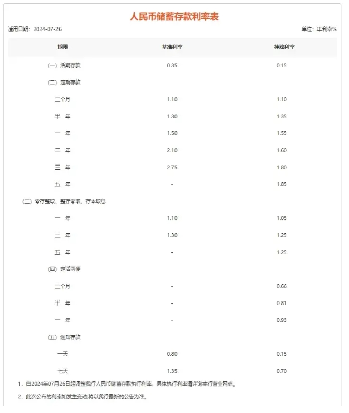 具體來看,招商銀行調(diào)整后的人民幣存款掛牌利率與六大銀行保持一致。活期存款年利率由0.20%調(diào)整為0.15%,下調(diào)5個(gè)基點(diǎn);整存整取定期存款三個(gè)月、六個(gè)月、一年期由1.15%、1.35%、1.45%調(diào)整為1.05%、1.25%、1.35%,均下調(diào)10個(gè)基點(diǎn);二年、三年、五年期由1.65%、1.95%、2.00%調(diào)整為1.45%、1.75%、1.80%,均下調(diào)20個(gè)基點(diǎn)。