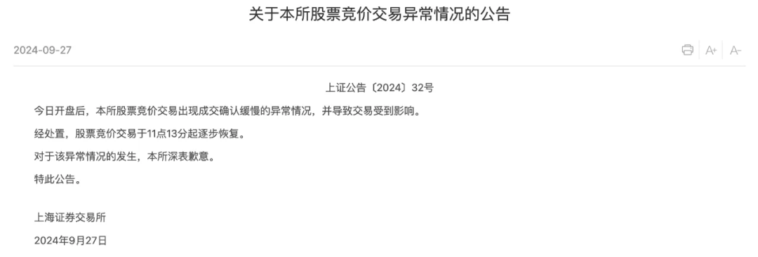 9月27日早盤,上交所股票交易出現異常,上交所隨后發布公告稱,本所股票競價交易出現成交確認緩慢的異常情況。經處置,上交所股票競價交易于11點13分起逐步恢復。上交所9月27日晚公告表示,對于該異常情況的發生,深表歉意。